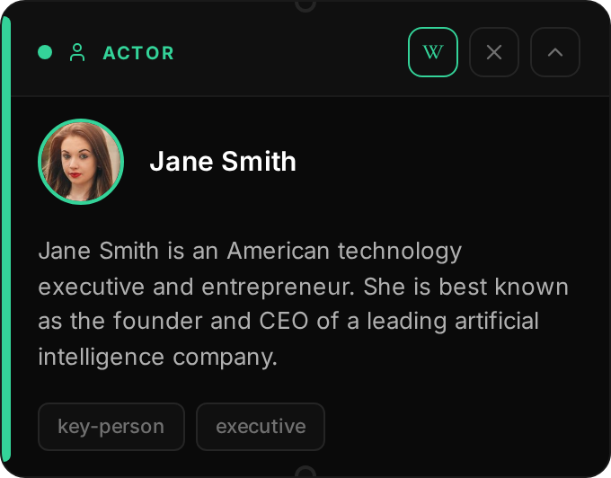 People and individuals involved in your investigation. Actors can represent real people, pseudonyms, anonymous sources, or any individual entity.