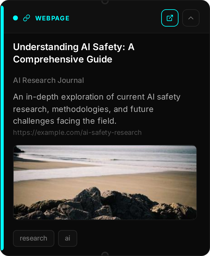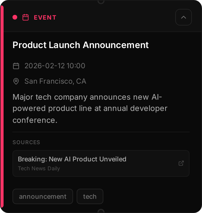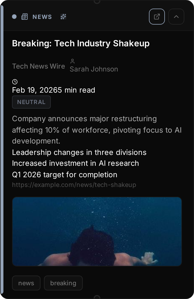 News articles with automatic content extraction and AI summarization. Newsfeed nodes turn article URLs into rich, searchable content.