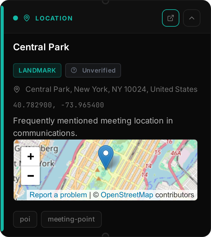Geographic locations with coordinates. Locations appear on the Map view and can be linked from Event nodes.