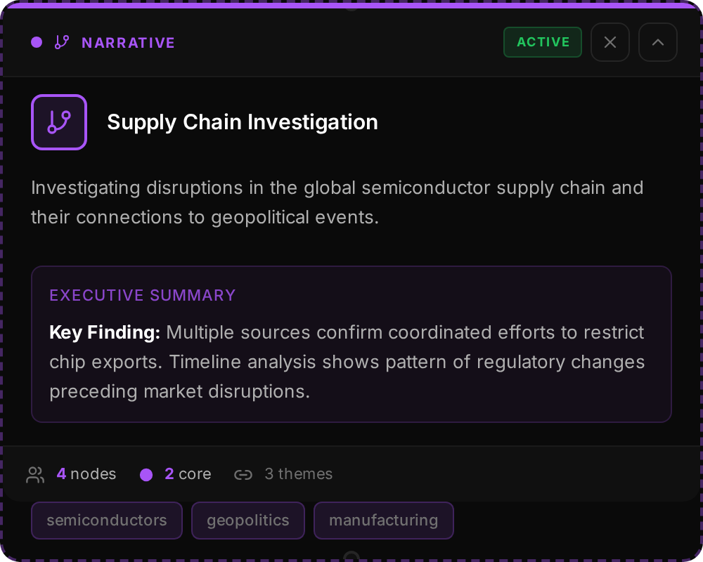 Storylines that group related nodes logically. Narratives help you organize complex investigations into coherent threads.