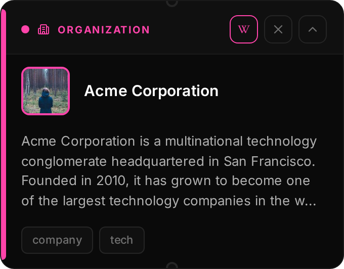 Companies, groups, agencies, and other organizations. Organizations can be linked to Actor nodes to show membership and affiliations.