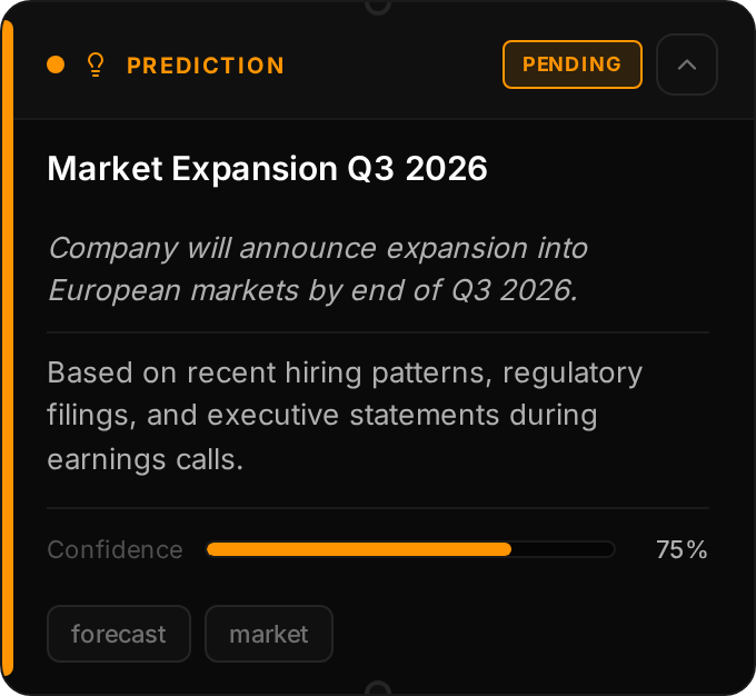 Hypotheses and predictions to track and verify over time. Predictions help you formalize analytical assessments and track their accuracy.