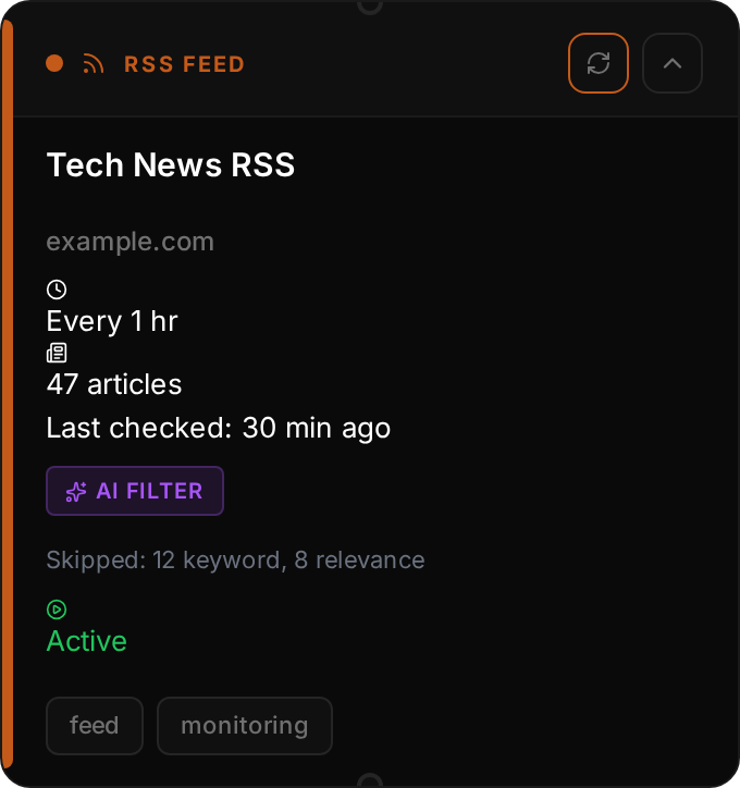 RSS feed subscriptions with AI-powered monitoring. RSS Feed nodes automatically poll sources and create Newsfeed nodes for relevant articles.