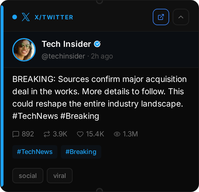 Social media posts from Twitter/X, Bluesky, Reddit, and other platforms. Social nodes preserve posts with full metadata for OSINT investigations.